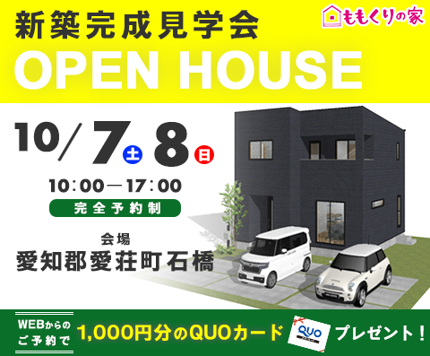 ももくりの家では、完成した住宅を期間限定のモデルハウスとして見学会を開催しております。ぜひ、お越しください。