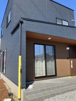 まずは外観!グレーのサッシにブラック枠のサッシで