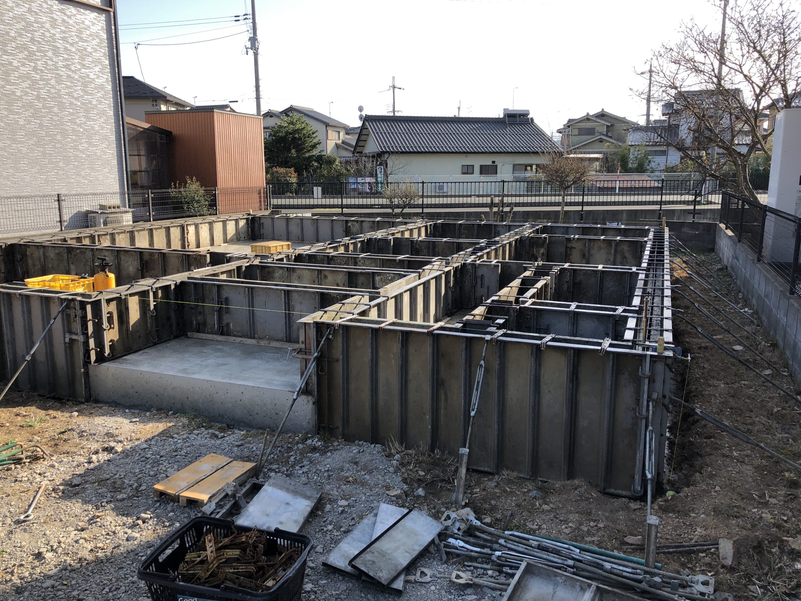こちらは高島市のK様邸です。枠と鉄筋は組みあがっていてもうすぐコンクリート打設です。