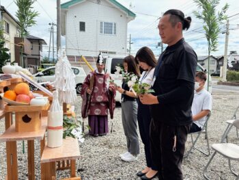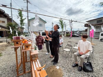 建築工事の着工前に、土地の神様(氏神様)に土地を利用する許可を得て、工事の安全と建物や家が末永く栄えることを祈願する儀式です。